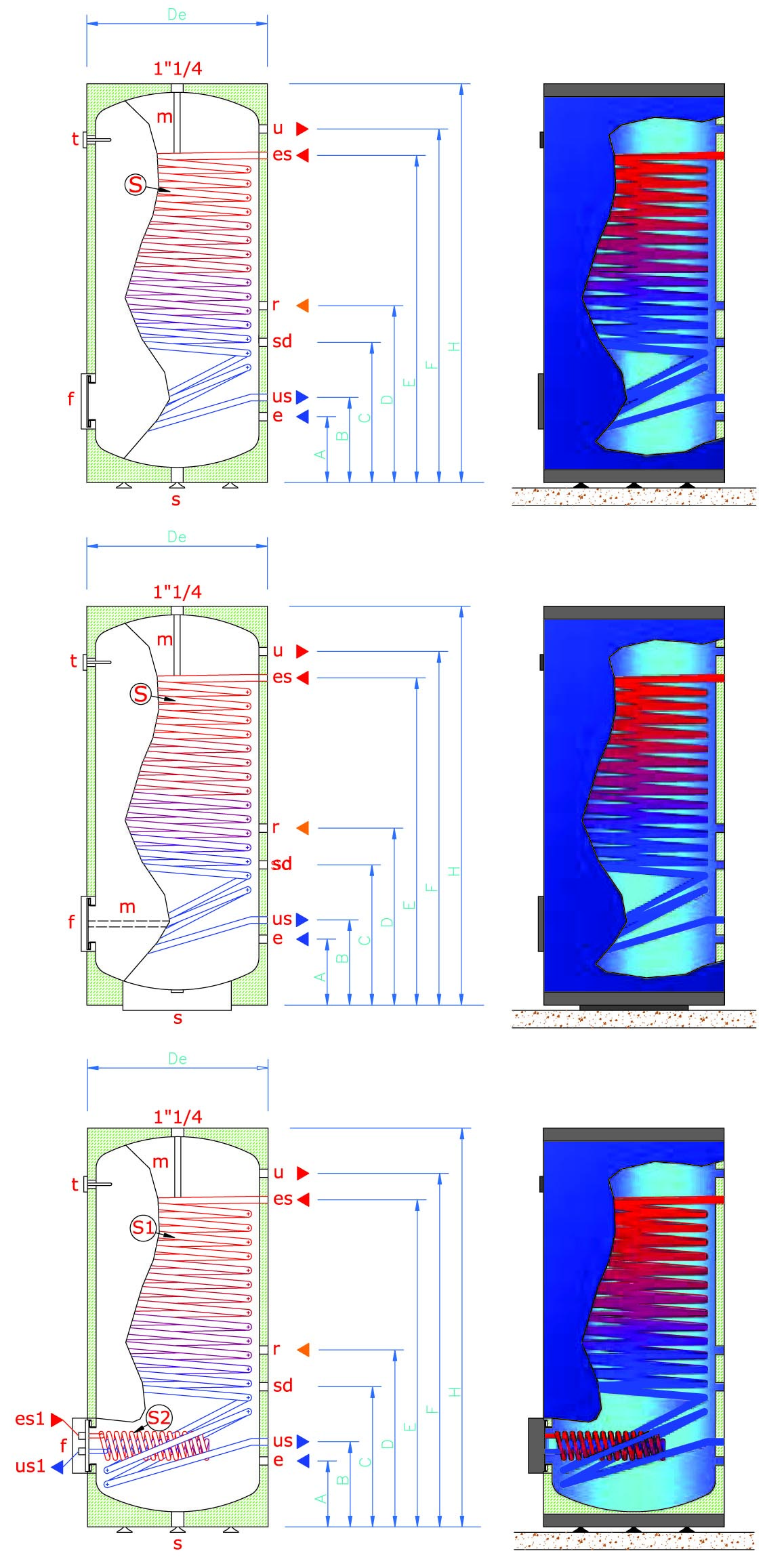- Todos los modelos incorporan de serie: brida de inspección, termómetro, conexión para un sensor para el serpentín, válvula de seguridad y pies de apoyo regulables (hasta el tamaño de 500 litros).
