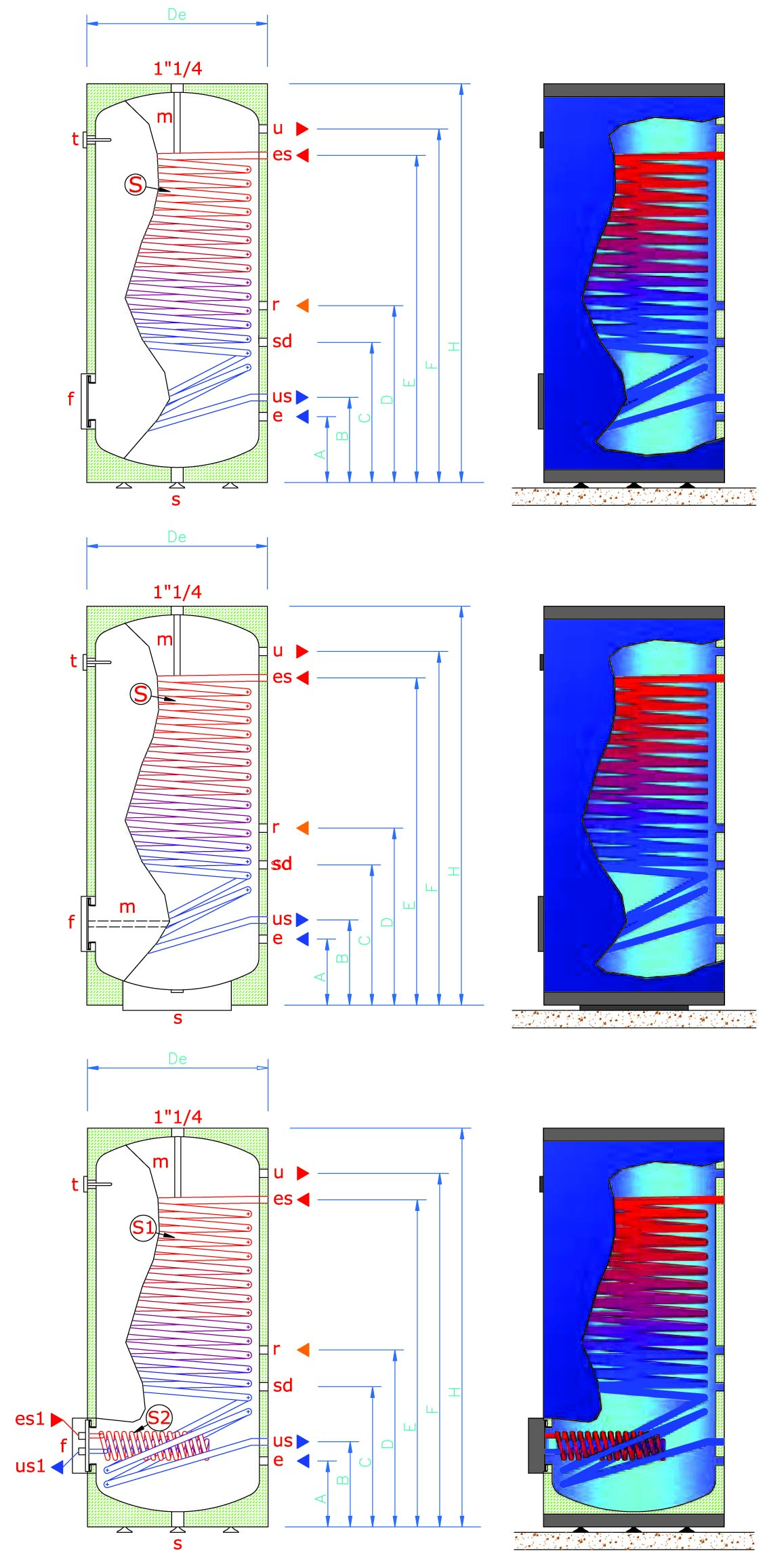 | Modelo | Código | Precio / Unidad (€) | Capacidad (l) | Dimensión A (mm) | Dimensión B (mm) | Dimensión C (mm) | Dimensión D (mm) | Dimensión F (mm) | Dimensión G (mm) | Dimensión H (mm) | De | Peso (kg) | Ø Conexiones e | Ø Conexiones u | Potencia 1 (kW) | Potencia 2 (kW) |