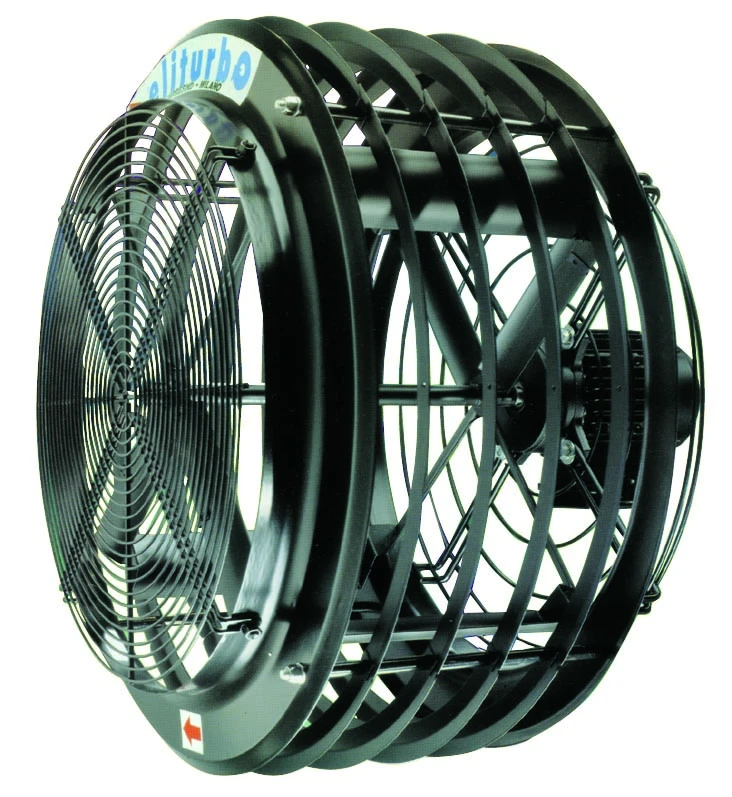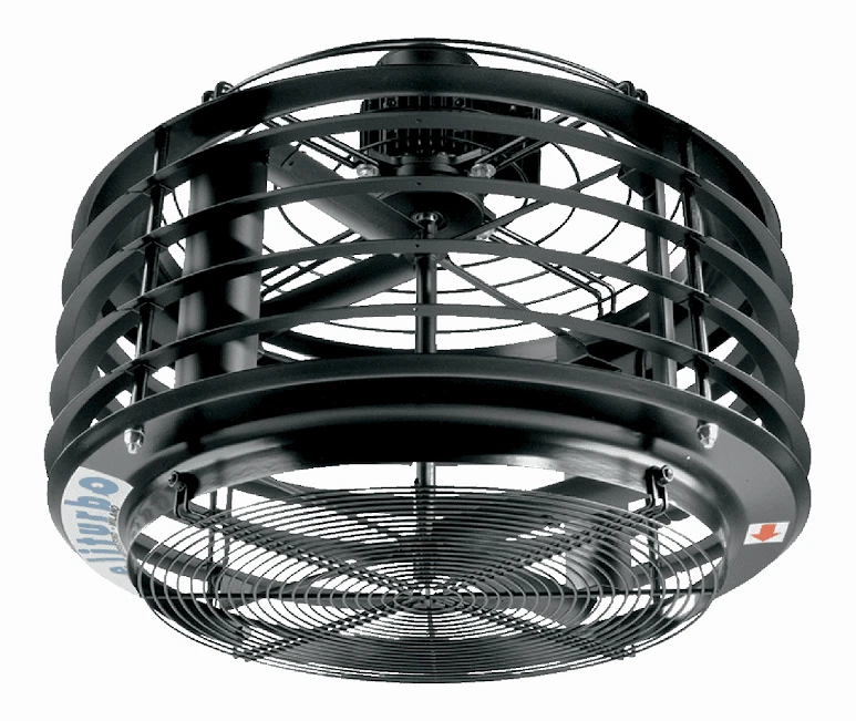 Alta efectividad en instalaciones de hasta 12 metros de altura. Se instalan simplemente colgados de cadenas a 1 ó 1,5 m. del techo, salteados con sentido de rotación alterno al de las unidades contiguas. Con el fin de repartir uniformemente la temperatura, los