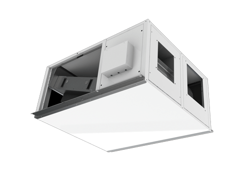 Recuperadores de calor equipados con ventiladores centrífugos EC de alta eficiencia y bajo consumo, envolvente de paneles de sandwich aislados con 23 mm de poliuretano inyectado, intercambiador rotativo de aluminio higroscópico. Gracias a la colocación de la rueda en posición inclinada, se consiguen alturas totales reducidas adecuadas para instalación en falso techo