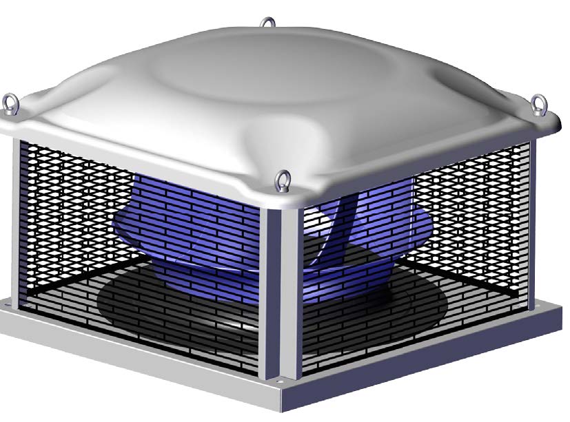 Extractores de tejado TECNAVENT QTC centrífugos con álabes curvados hacia atrás para instalación en tejados y cubiertas, diseñados específicamente para la extracción de aire de locales que requieren gran caudal y gran presión disponible tales como fábricas, almacenes, pabellones deportivos, bazares, tiendas. Su uso ligado a sistemas de climatización evaporativa es muy común, proporcionando una ventilación por desplazamiento eficaz.