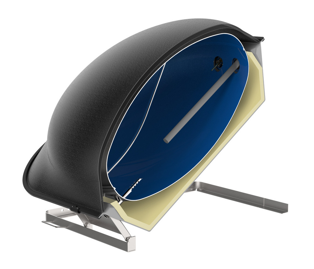 TECNA DISCOTERM y DISCOSOL son calentadores de agua que aprovechan la energía solar durante el día, gracias a su cúpula exterior transparente de PMMA (plancha acrílica de polimetacrilato extruida), que permite que los rayos solares calienten el agua contenida en su interior. La parte inferior de chapa galvanizada está vitrificada a alta temperatura para evitar la corrosión y aislada térmicamente con un gran espesor de poliuretano de alta densidad, que evita que el gua se enfríe durante la noche y se