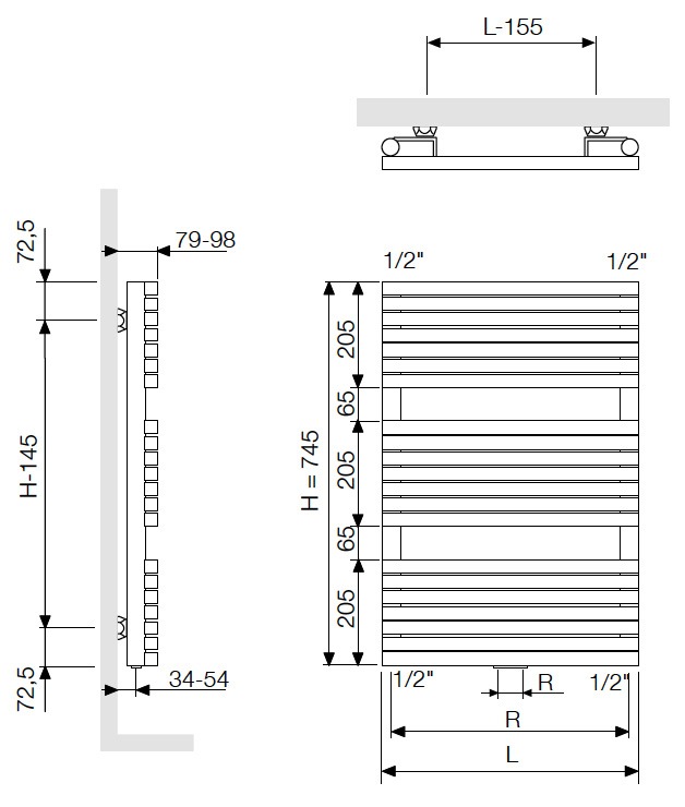 Modelo | Código | Acabado | Alto (mm) H | Ancho (mm) L | Fondo desde pared al extremo del radiador (mm) | Distancia entre ejes (mm)R | Contenido en agua (l) | Peso (Kg) | Número de tubos | Potencia térmica Φ Δ T 50K 75/65/20°C | Potencia térmica Φ Δ T 30K 55/45/20°C | Exponente n | Precio / Unidad (€) |