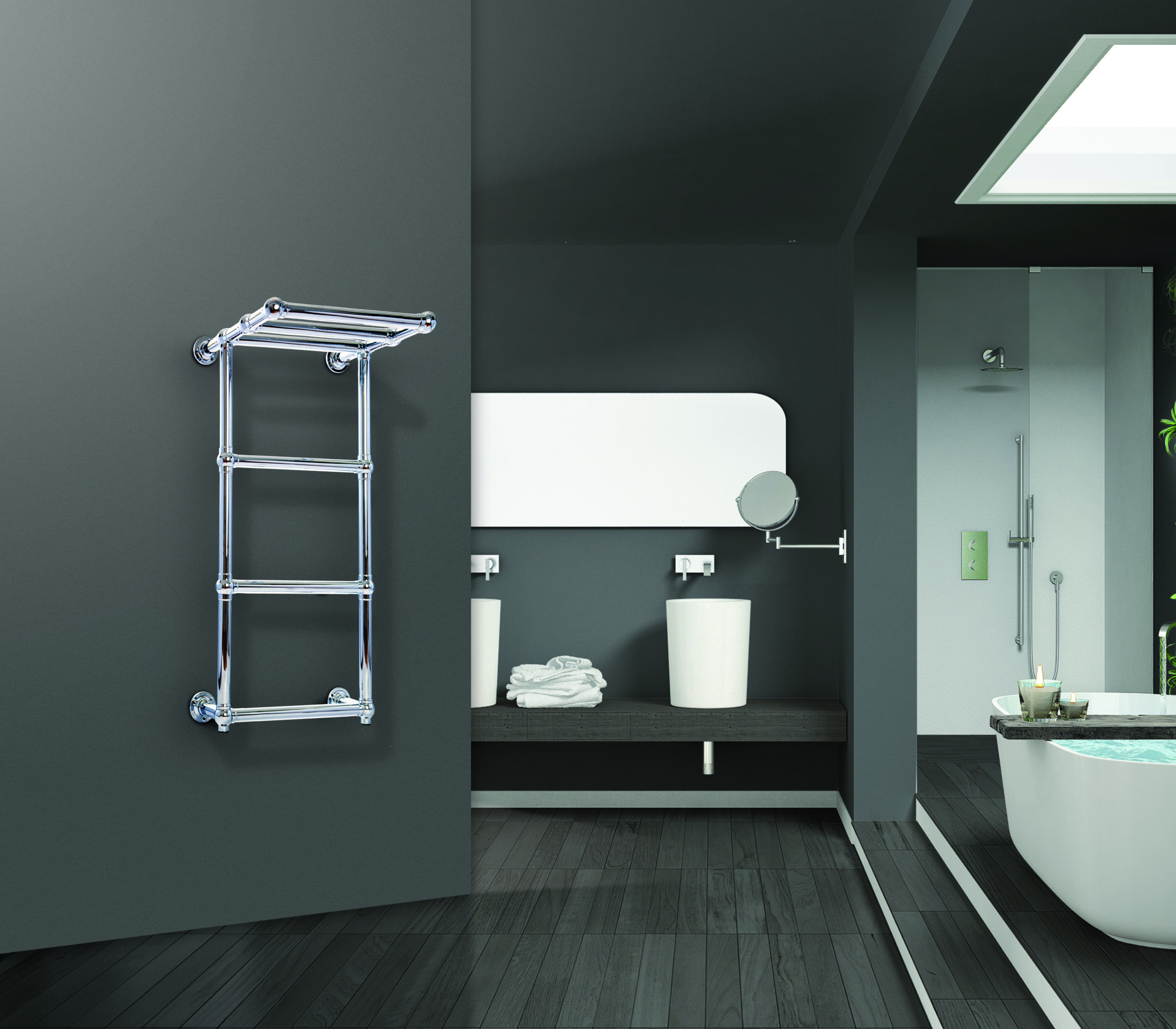 Radiador toallero CICSA Corallo, de la gama Deco. Diseñado especialmente para colocarlo en el baño, es estético y muy útil, ya que se puede usar como calefacción y secatoallas. Fabricado en acero. Con versión hidráulica y eléctrica. Potencia térmica de 378 W. Sus medidas son de 998 mm a 500 mm (alto) x 500 mm (ancho) y una distancia entre ejes de 426 mm. Disponible en color blanco, negro y cromado.