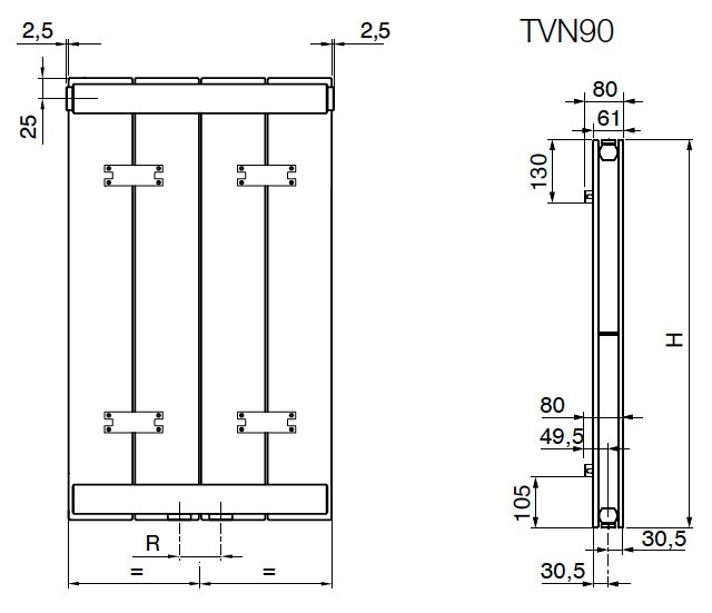 - Tubo Plano vertical 77 x 10 mm espaciados 3 mm. El espaciado entre tubos es de 3 mm para un efecto visual decorativo y una mayor eficacia radiante.
