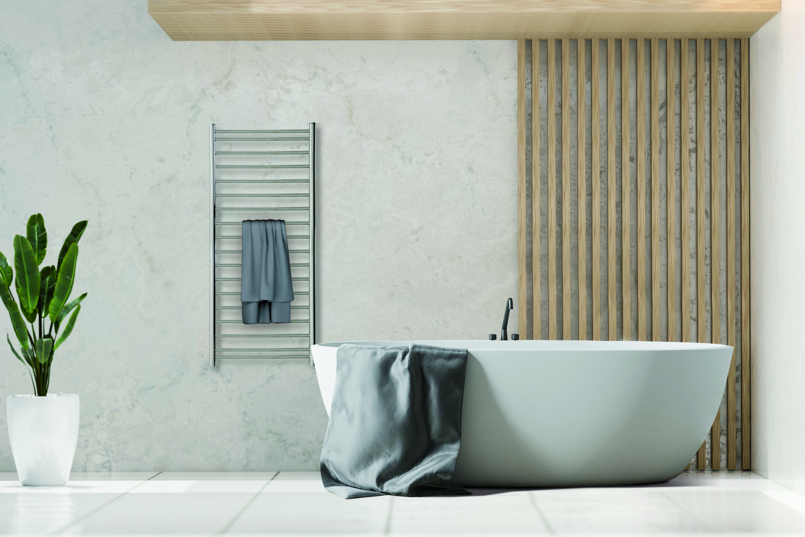 Radiador toallero CICSA Eco Inox, de la gama Acero Inox. Está diseñado para su colocación en el cuarto de baño, ayudando a personalizarlo y a convertirlo en un lugar único. Especial para zonas de mayor humedad. Fabricado en acero inoxidable. Con versiones hidráulica y eléctrica. Potencia térmica de hasta 335 W. Sus medidas son de 800 a 1200 mm (alto) x 482 a 532 mm (ancho) y una distancia entre ejes de 450 mm a 500 mm. Disponible en color pulido brillo, oro brillo, cobre brillo, oro mate y cobre mate.