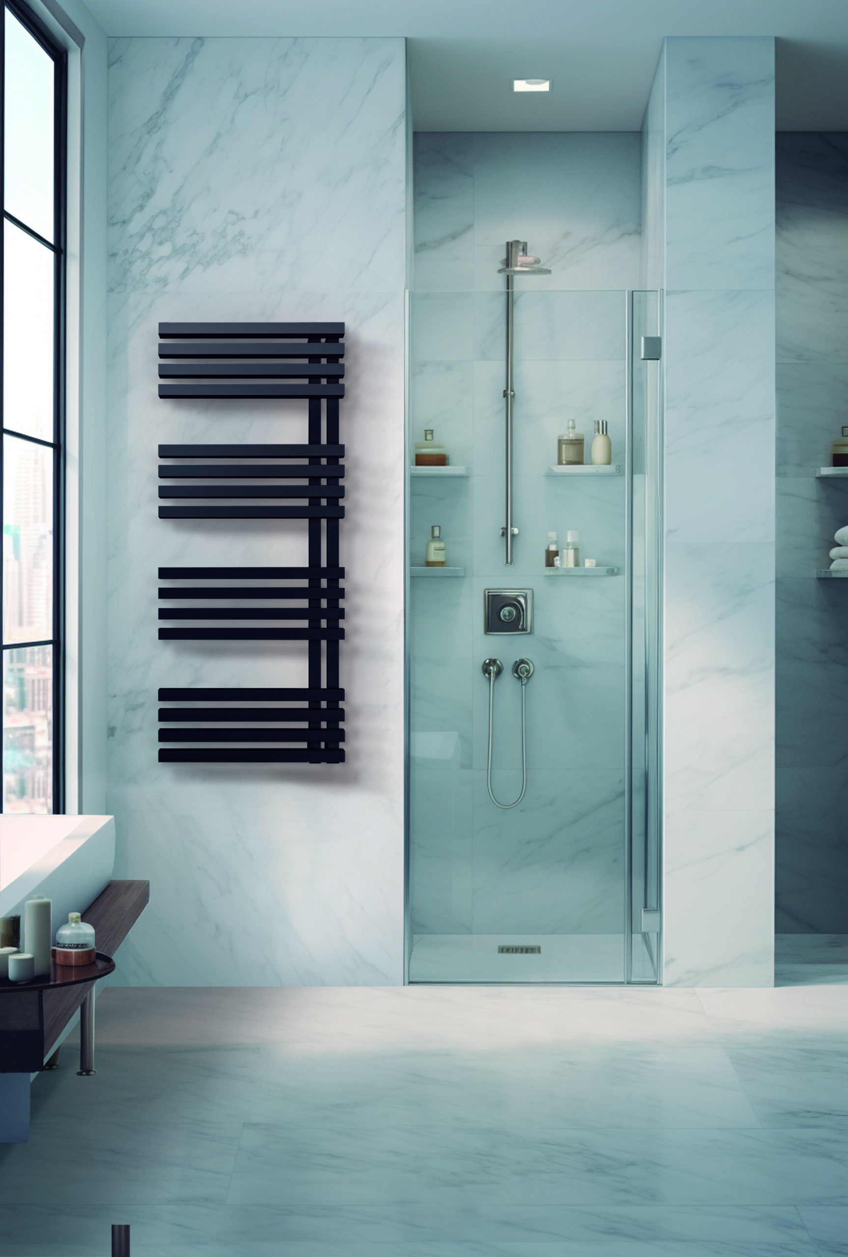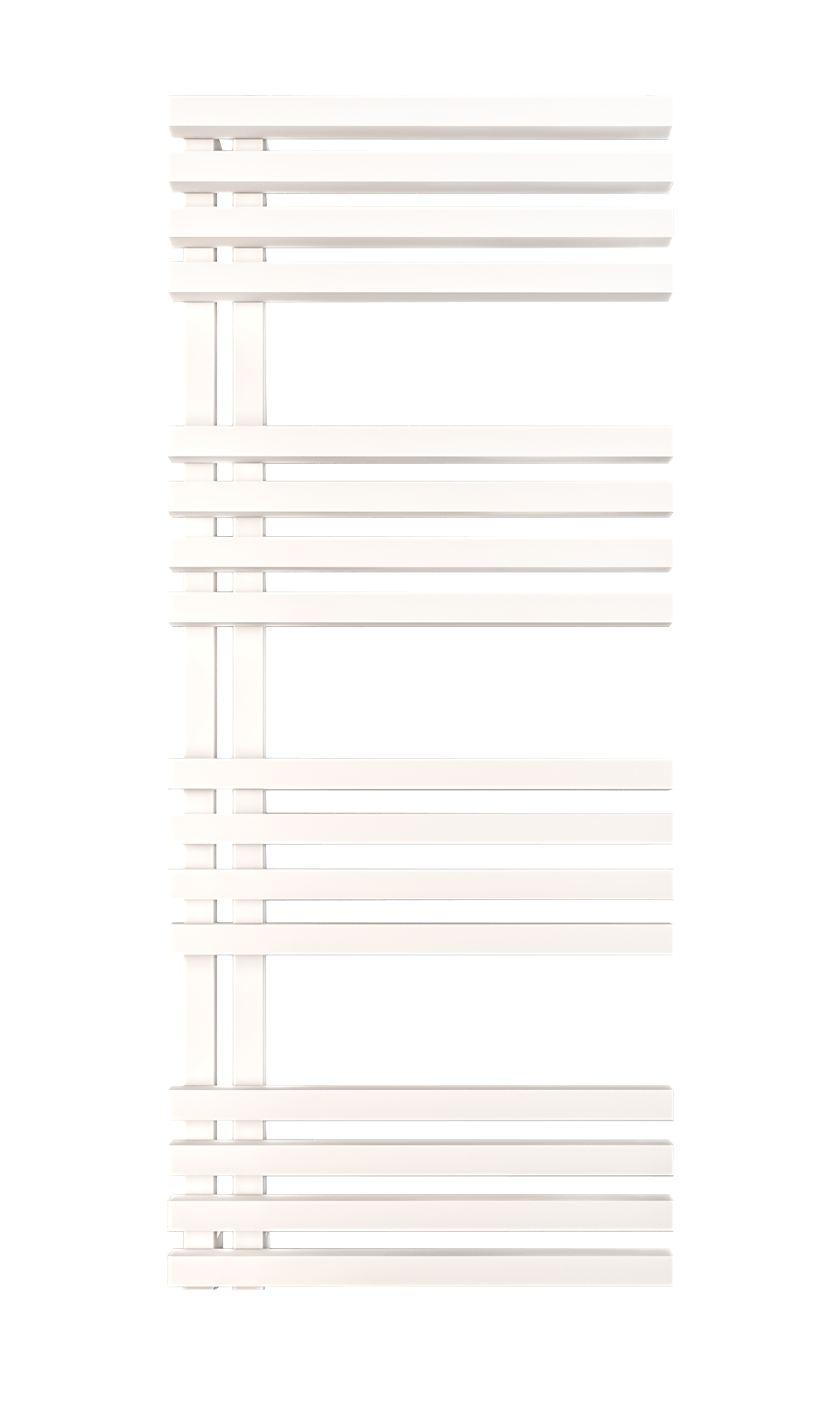 Radiador toallero CICSA Kosmo, de la gama Deco. Diseñado especialmente para colocarlo en el baño, es estético y muy útil, ya que se puede usar como calefacción y secatoallas. Fabricado en acero. Con versiones hidráulica y eléctrica. Potencia térmica de hasta 530 W. Sus medidas son de 800 mm a 1200 mm (alto) x 500 mm (ancho) y una distancia entre ejes de 50 mm. Disponible en blanco mate y negro mate, ambos con textura.
