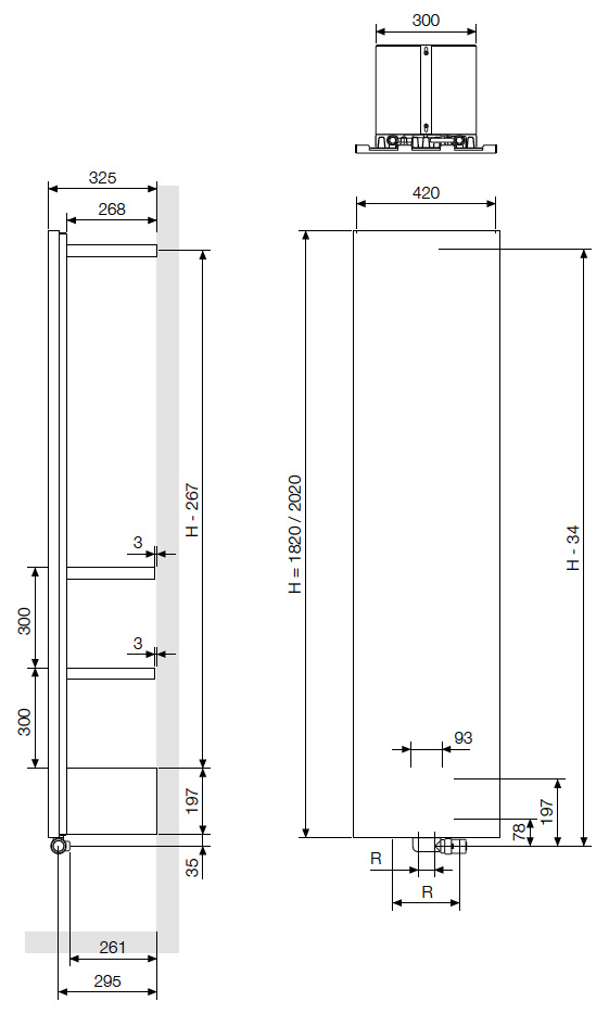 | Modelo | Código | Acabado | Alto (mm) H | Ancho (mm) L | Fondo desde pared al extremo del radiador (mm) | Distancia entre ejes (mm) R | Contenido en agua (l) | Peso (Kg) | Potencia térmica Φ Δ T 50K 75/65/20°C | Potencia térmica Φ Δ T 30K 55/45/20°C | Exponente n | Precio / Unidad (€) |