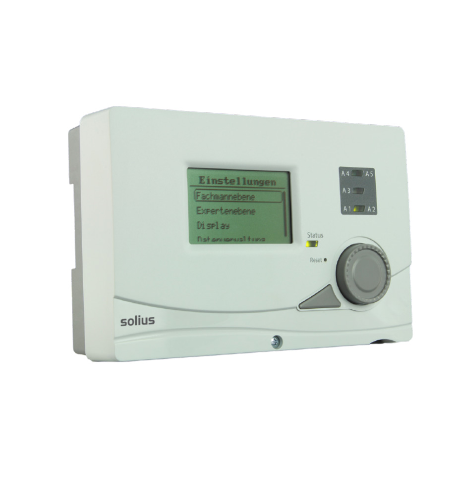 Control solar diferencial electrónico SOLIUS 67, con capacidad para una amplia variedad de sistemas posibles, con lectura de 6 sensores de temperatura (PT1000), contador de energía y programación muy versátil.
