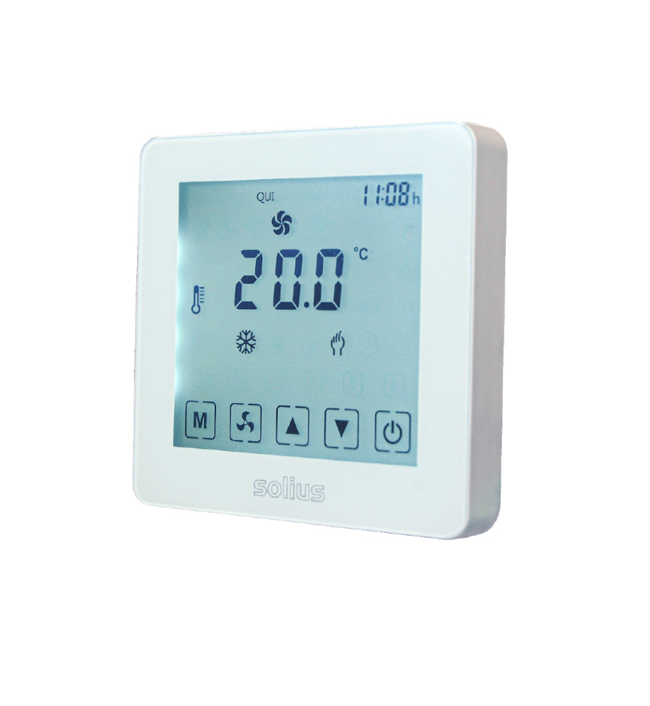 Cronotermostato ambiental SOLIUS 812 con pantalla táctil. Temperatura y humedad ambiente, velocidad del ventilador y estado de la válvula, hora y día de la semana, programa horario manual/automático y periodo actual, modo de funcionamiento (calefacción/refrigeración), lectura y visualización de la temperatura ambiente y la humedad relativa.
