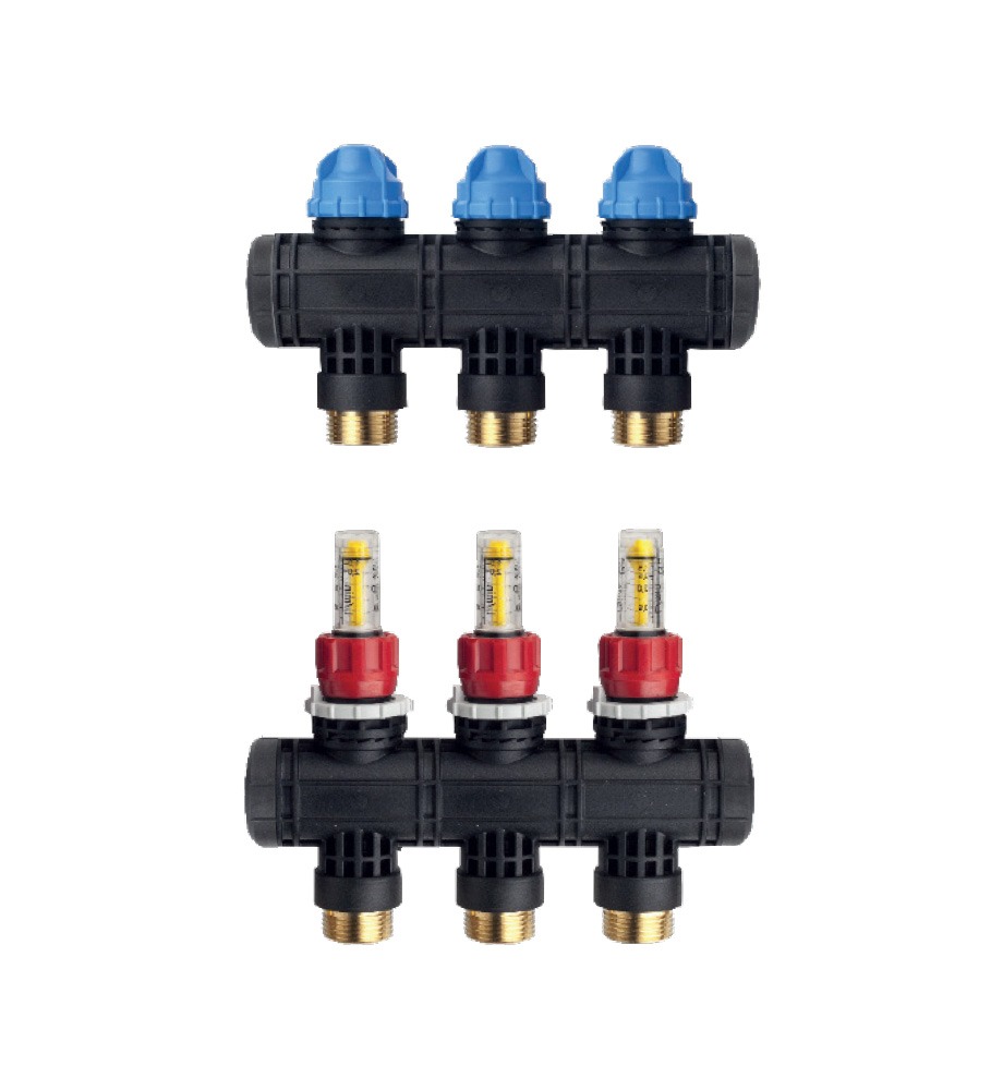 Colector modular de suelo radiante fabricado en poliamida. El colector se forma mediante la unión de conjuntos de 1, de 3 o de 6 salidas al que debe sumarse el kit colector y los euroconos.